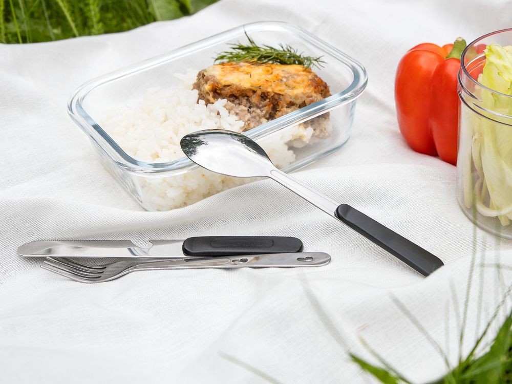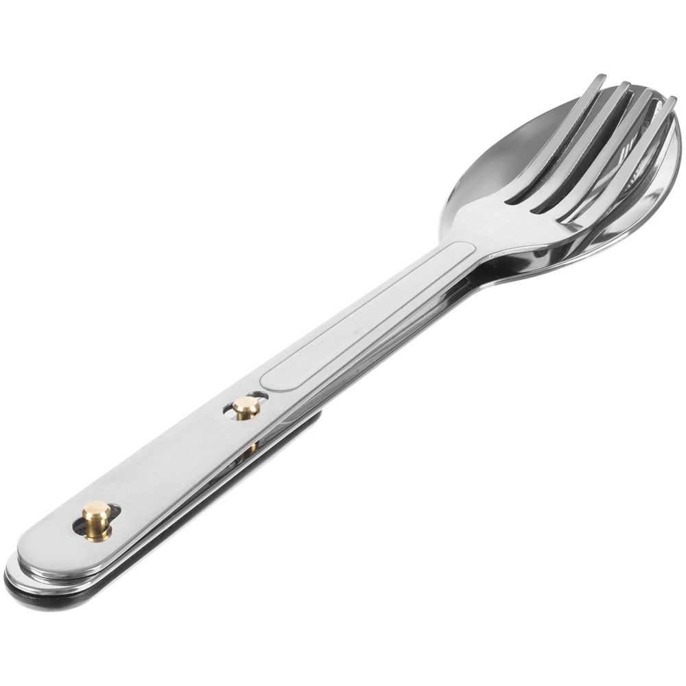 Набор столовых приборов из ложки, вилки и ножа с открывашкой с разборной конструкцией.