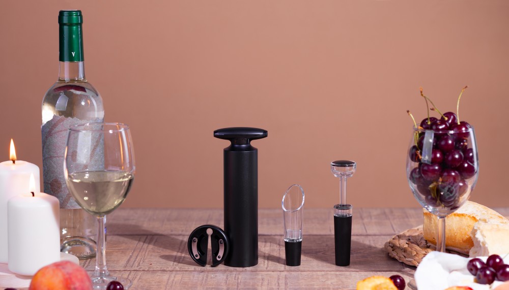 Набор из четырех аксессуаров для вина позволяет подготовить благородный напиток и в полной мере насладиться его вкусом.