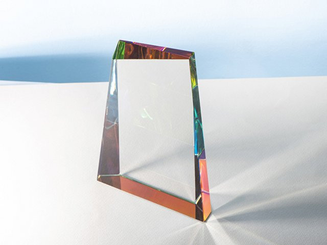 Награда выполнена из прозрачного стекла, переливающегося на свету всеми цветами радуги, и не имеет постамента. Под разными углами награда сияет разными цветами, а иногда и всем радужным спектром сразу. Благодаря необычной форме, напоминающей философский камень, и сиянию в лучах света она смотрится очень оригинально. • Интересный дизайн • Переливается всеми цветами радуги