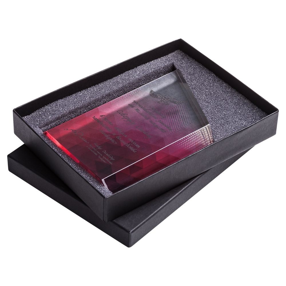 Стела поставляется в подарочной упаковке.При печати стоит использовать антистатик для акрила. Не рекомендуем протирать награды спиртом перед нанесением: акрил будет трескаться. В зависимости от желаемого эффекта, фон может быть напечатан с подложкой или без подложки.