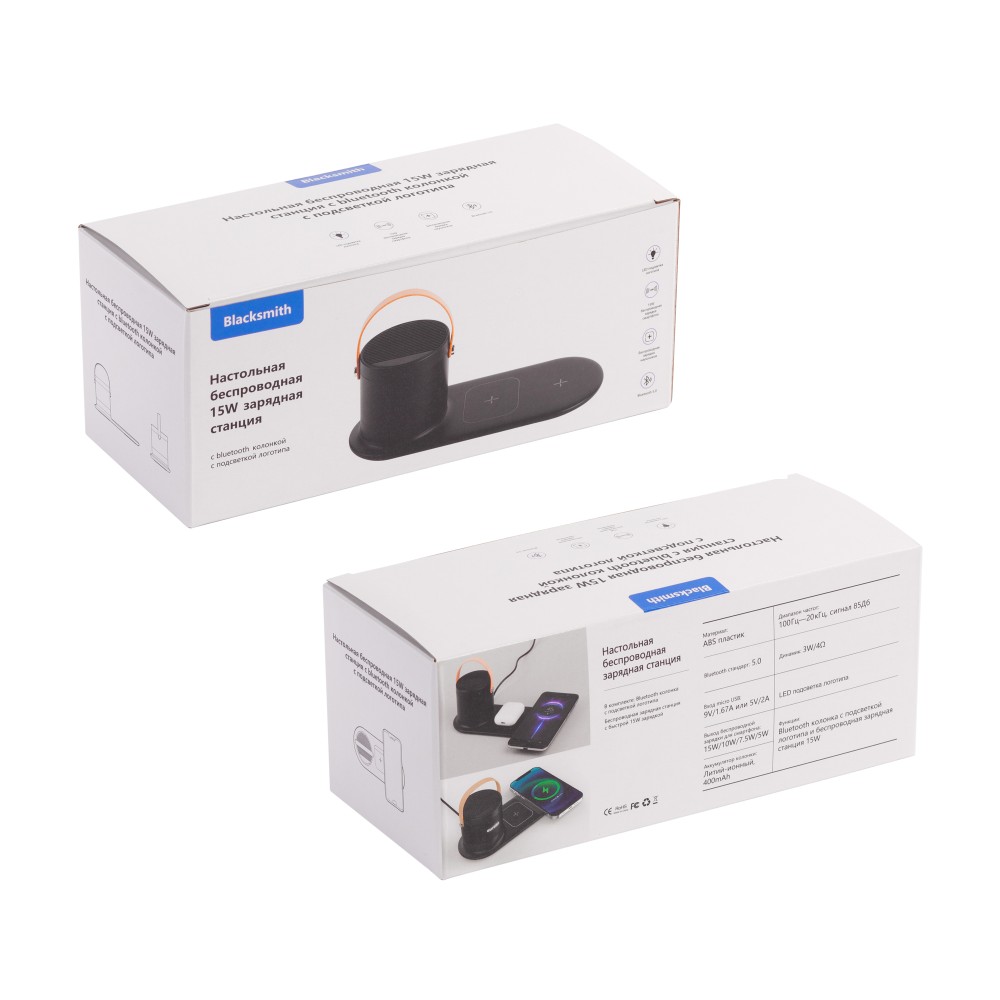 Комплексное предложение – настольный набор из мобильной bluetooth колонки и беспроводной зарядной станции с увеличенной мощностью передачи заряда (15W) для смартфона и наушников. Эффектное дополнение – круговая подсветка логотипа на корпусе колонки.
