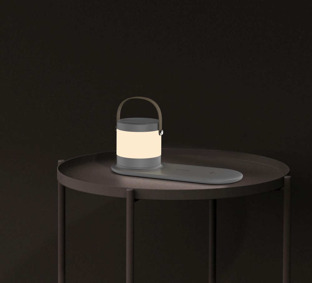 Настольный набор из мобильной bluetooth колонки-лампы и беспроводной зарядной станции с увеличенной мощностью передачи заряда (15W) для смартфона и наушников. Лампа-ночник управляется сенсорной кнопкой и имеет 2 режима светового потока – тёплый и холодный.