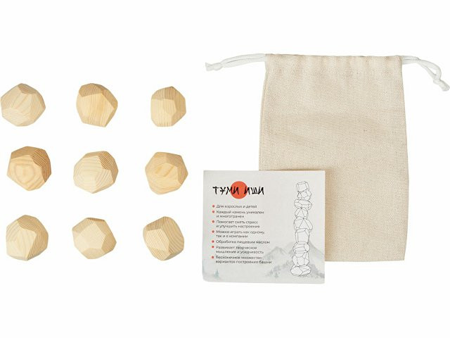 Туми иши — это древняя японская игра, название которой переводится как «Гора из камней». Эта игра позволяет отвлечься от суеты и снять стресс, что очень актуально в ритме жизни больших городов. Цель игры проста — построить устойчивую гору, а точнее пирамидку, из камней, входящих в комплект игры (9 шт.). Однако это не так просто сделать — каждая фигура имеет уникальную многогранную форму, поэтому придётся потрудиться, чтобы конструкция держалась и сохраняла равновесие. Добиться этого можно только сконцентрировавшись и отбросив лишние переживания, которые могут заставить руку дрогнуть в неподходящий момент. Туми иши помогает развивать и тренировать терпение, точность движений и концентрацию на процессе, а в командной игре — сплочённость и внутреннюю гармонию игроков. В комплекте также идёт мешочек из неокрашенного хлопка для хранения игры, на котором будет отлично смотреться ваш логотип! - натуральные материалы: сосна, хлопок; - количество игроков от 1 до 9; - безопасность — камни выполнены из дерева; - улучшает концентрацию и снижает стресс; - подходит для медитации.