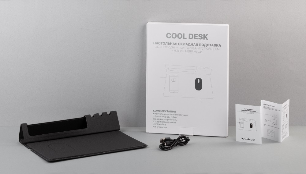 Настольная складная подставка "Cool Desk" с беспроводным (10W) зарядным устройством и ковриком для мыши, темно-серый