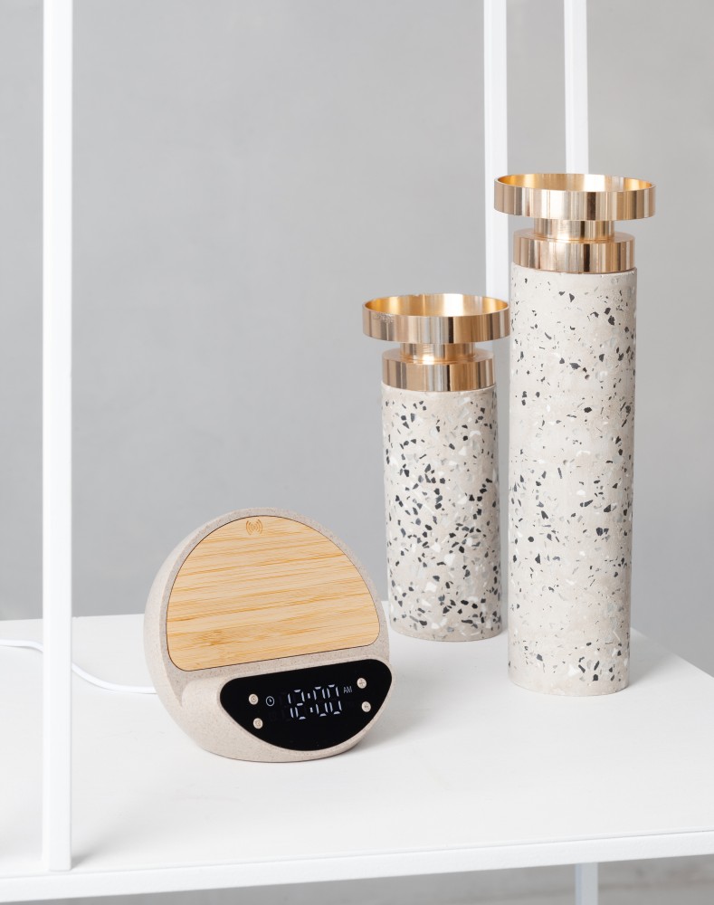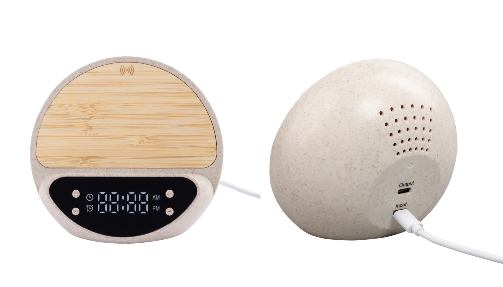 Электронные часы с будильником и быстрым беспроводным зарядным устройством в актуальном экологичном корпусе из пластика с пшеничным волокном и бамбука. Дополнительная функция - зарядка гаджетов проводным (с помощью кабеля) способом через имеющийся в корпусе часов разъём USB.