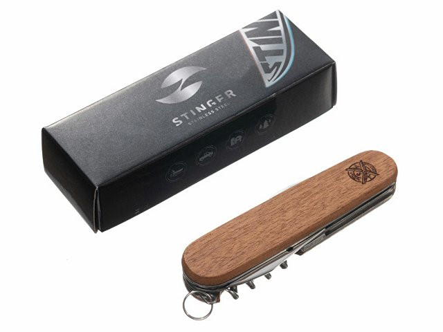 Нож перочинный STINGER имеет 10 функций: 1. Большое лезвие 2. Консервный нож с: 3. – Малой отвёрткой 4. Шило с: 5. – Иглой 6. Штопор 7. Открывалка для бутылок с: 8. – Отвёрткой 9. – Инструментом для снятия изоляции 10. Кольцо для ключей ХАРАКТЕРИСТИКИ Материалы: • лезвие/инструменты: нержавеющая сталь AISI 420, твердость 44-48 HRC • рукоять: нержавеющая сталь AISI 420, твердость 44-48 HRC • накладки рукояти: АБС-пластик Размер: 90 мм Вес: 63 г Цвет накладок рукояти: коричневый Накладки рукояти ножа не подлежат замене. Упаковка: картонная коробка