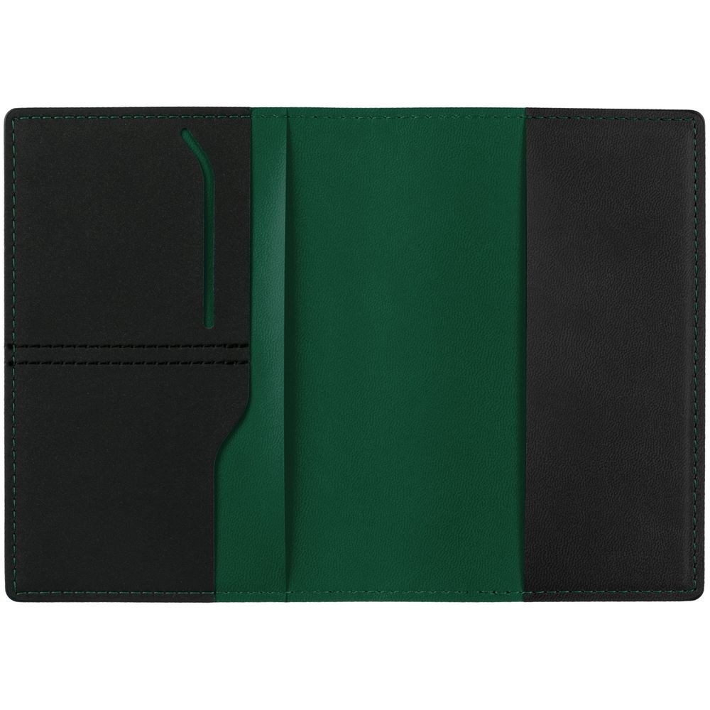 Имеет основное отделение для паспорта и 2 отделения для визиток или кредитных карт.