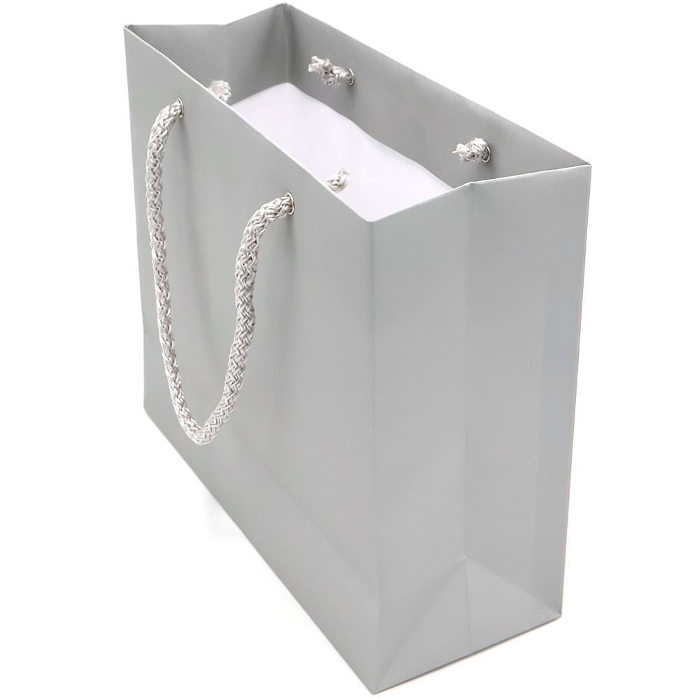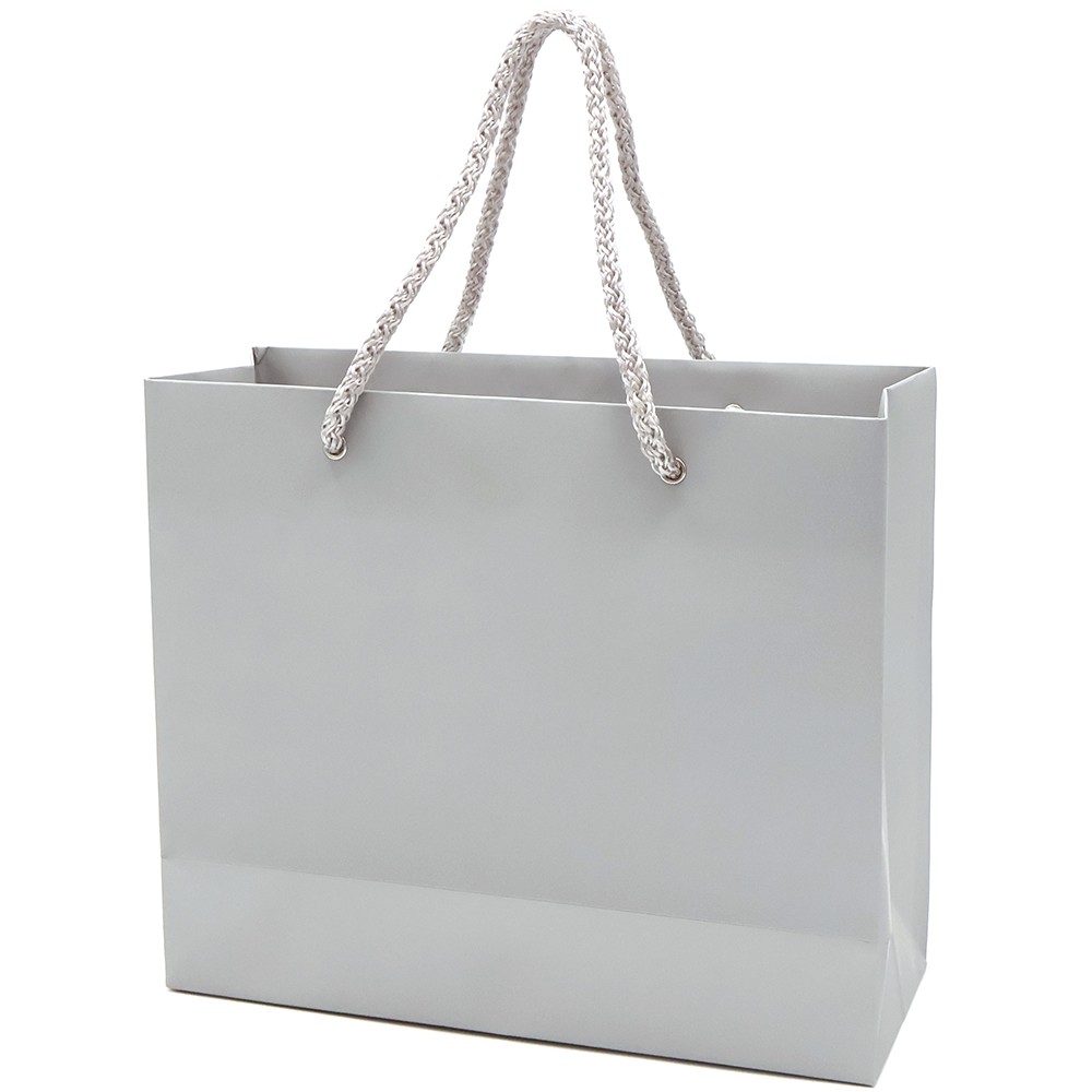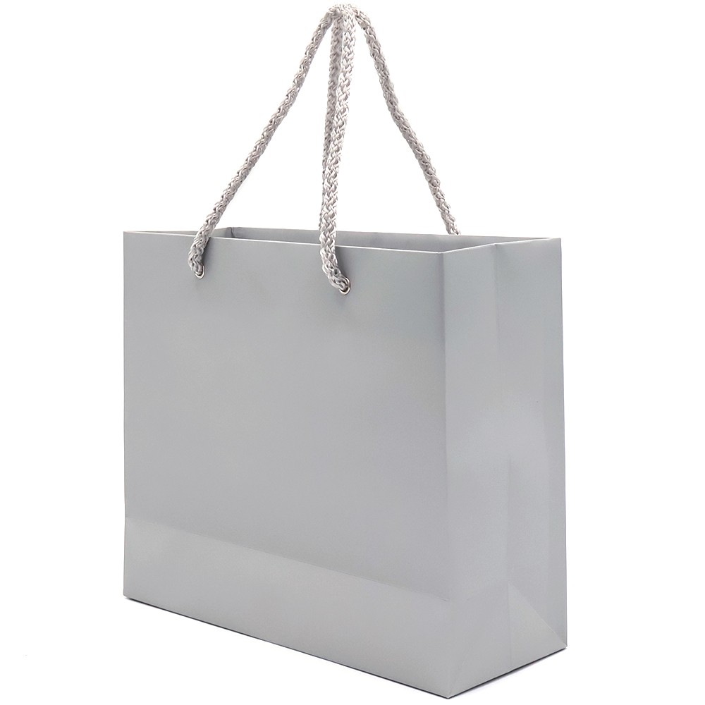 Бумажный цветной пакет плотностью 170 г/м². Покрытие софт-тач. Шнур 6 мм серого цвета. Люверс - серебристый.