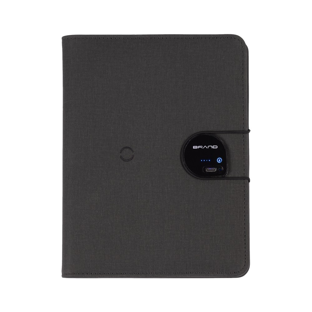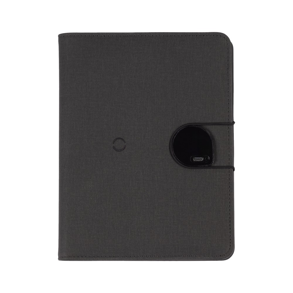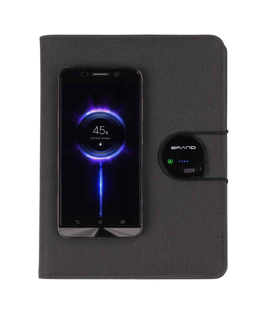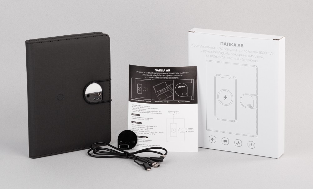 Беспроводной зарядный блок, встроенный в обложку папки, оснащён функцией MagSafe – магнитным держателем для iPhone двенадцатой серии и выше. Складная подставка внутри папки обеспечивает удобное расположение смартфона для комфортного просмотра видео и фото. Через разъём Type-C можно не только пополнять батарею папки, но и используя кабель заряжать от папки Ваши гаджеты. Блокнот после полного заполнения можно заменить на новый. Место расположения подсветки логотипа одновременно является сенсорной панелью включения/выключения беспроводной зарядки и индикатором уровня заряда.