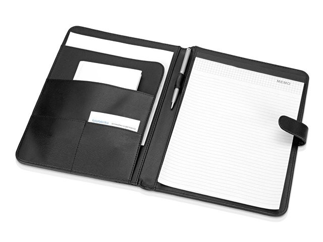 Строгая деловая папка для документов прекрасно подойдет для классического офисного стиля. Карманы для документов и визиток, сменный блокнот, держатель для ручки. Кнопочная застежка. Плотная обложка из кожзаменителя. Возможна персонализация: тиснение или шильд.