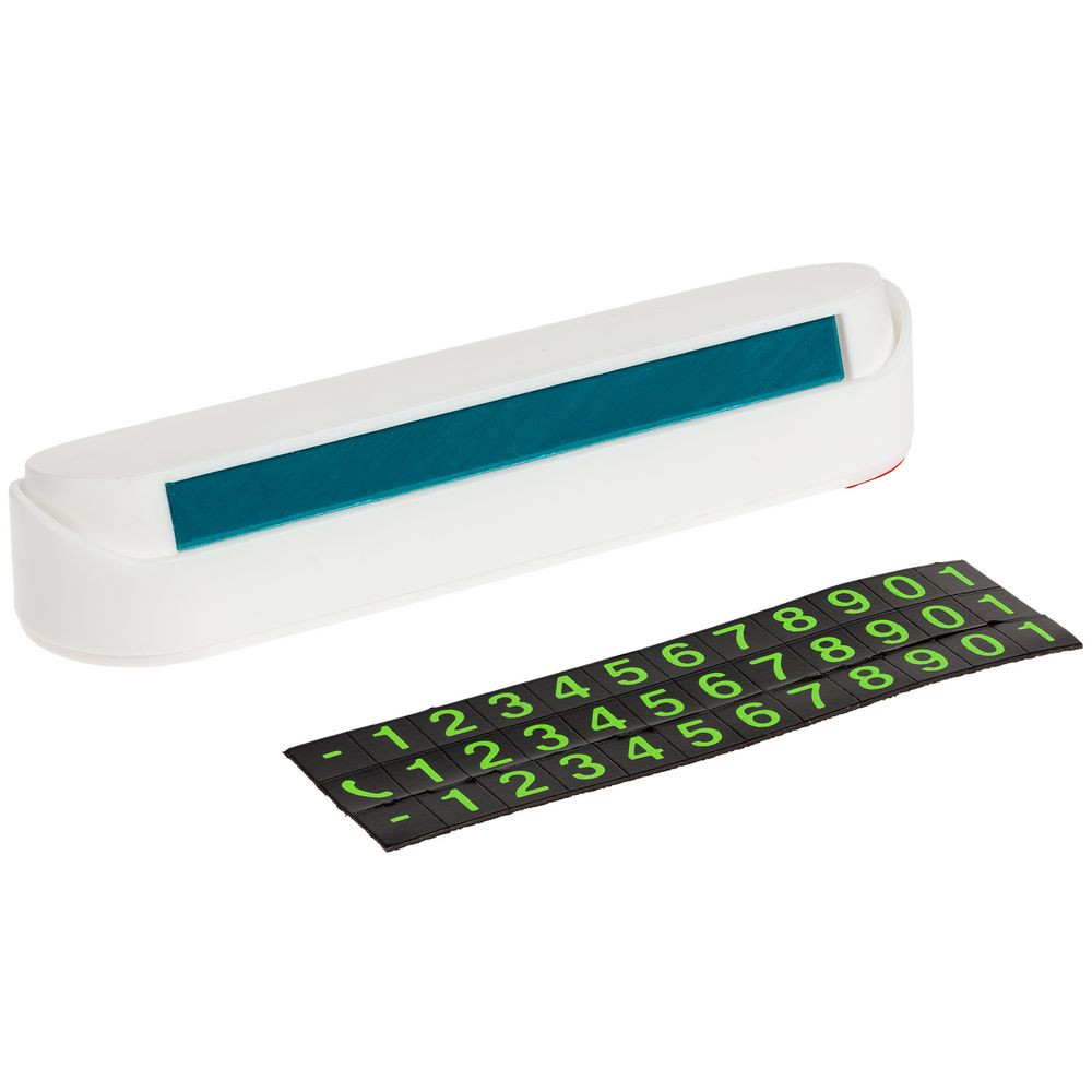 В наборе подставка с клейким основанием и комплект магнитных символов — при изменении номера телефона данные на визитке легко скорректировать.