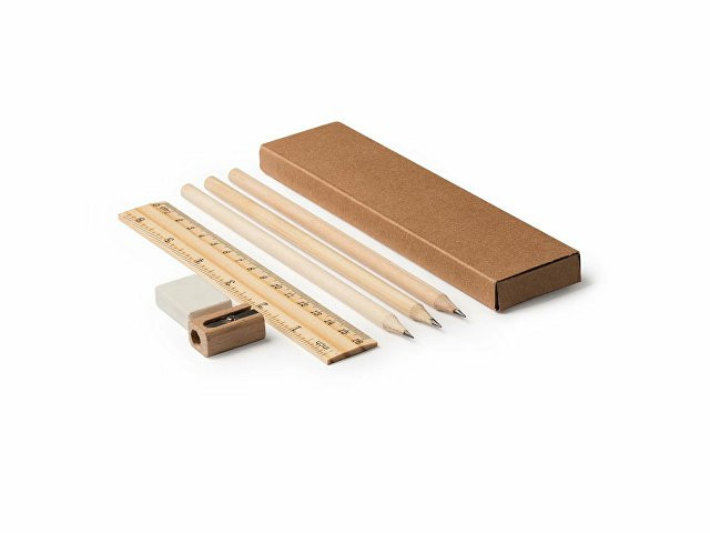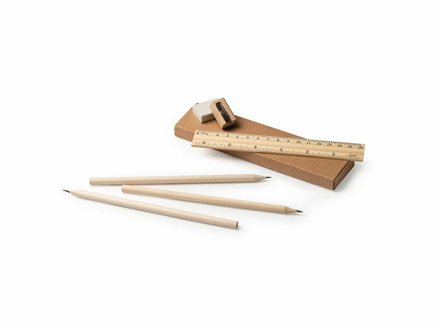 Письменный набор из натурального дерева в картонной коробке. В комплекте линейка, 3 карандаша, 1 ластик и 1 точилка.