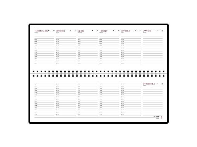 Недатированный планинг выпускается размером 305*130 мм и содержит 128 страниц (блок 292 х100 мм). Для них выбрана высококачественная белая бумага плотностью 70 грамм. Разворот представляет собой разметку на 7 дней недели с графами с указанием времени. Месяц и день недели указаны на русском и английском языках. Первые 15 страниц содержат справочные сведения из различных областей на русском языке. Крепление листов на открытом гребне способствует быстрому переходу по страницам. Современная, практичная обложка из приятного на ощупь материала с легким прорезиненным эффектом хорошо подходит для тиснения. Декоративная прострочка нитью в тон подчеркивает закругленную форму обложки.