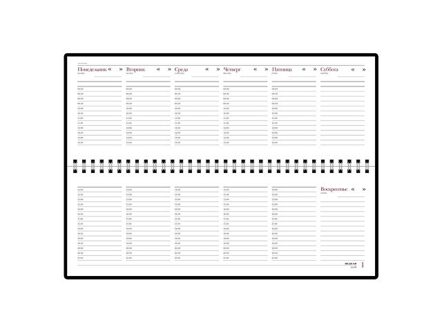 Недатированный планинг выпускается размером 305*130 мм и содержит 128 страниц (блок 292 х100 мм). Для них выбрана высококачественная белая бумага плотностью 70 грамм. Разворот представляет собой разметку на 7 дней недели с графами с указанием времени. Месяц и день недели указаны на русском и английском языках. Первые 15 страниц содержат справочные сведения из различных областей на русском языке. Крепление листов на открытом гребне способствует быстрому переходу по страницам. Современная, практичная обложка из приятного на ощупь материала с легким прорезиненным эффектом хорошо подходит для тиснения. Декоративная прострочка нитью в тон подчеркивает закругленную форму обложки.