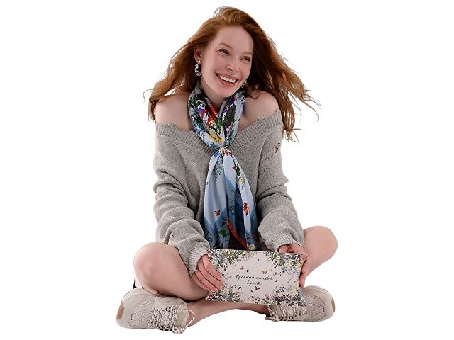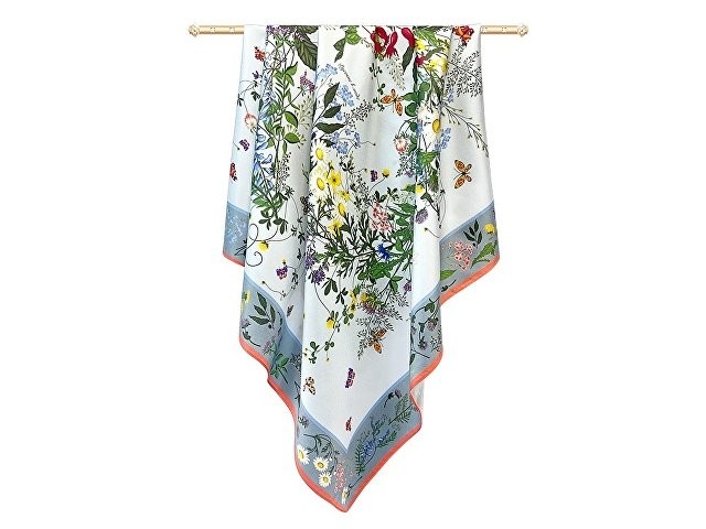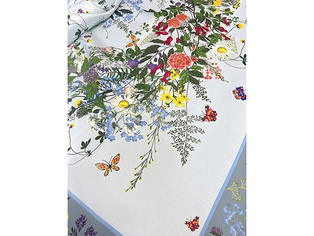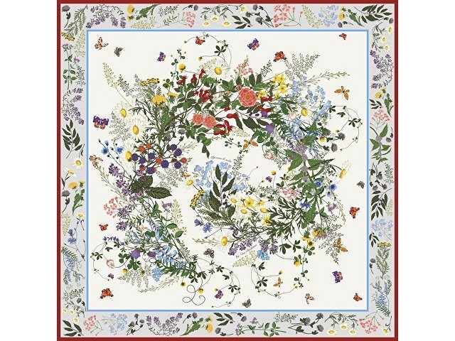 Яркое благоухающее разноцветье русского полевого букета воплощено в шелковом платке, где собраны изображения более 20 цветов и трав. Чудесные незабудки и ромашки, нежные васильки, пышный клевер образуют полукруг венка с вплетенными листьями лавра, чабреца, мяты. Пудровый тон фона создает ощущение простора и воздуха, а контрастная окантовка делает драпировку платка особенно эффектной. Красноречивее слов, цветы способны рассказать о многих чувствах. Платок «Русский полевой букет» станет выражением любви, олицетворением изящества и источником радости. Над дизайном работали: Нина Ручкина, Ксения Ковражкина