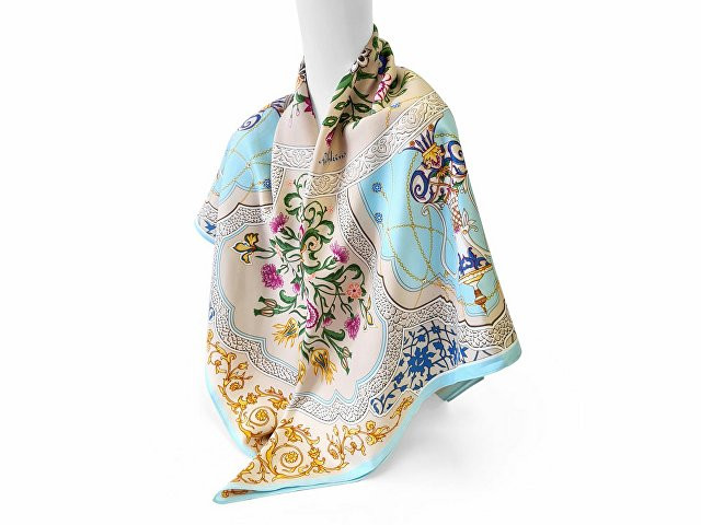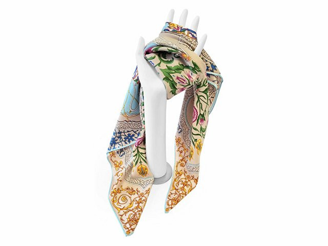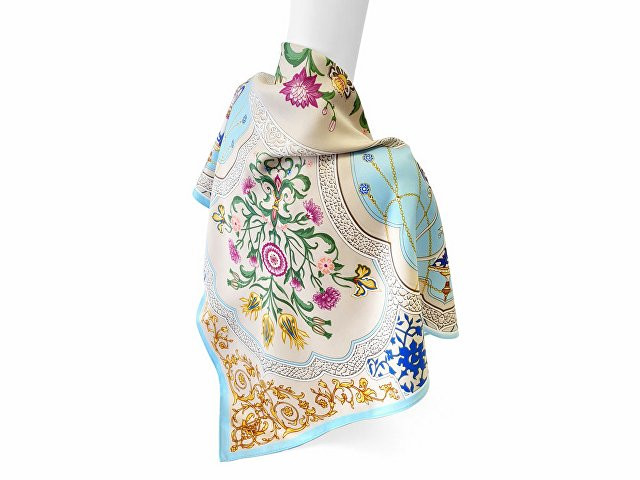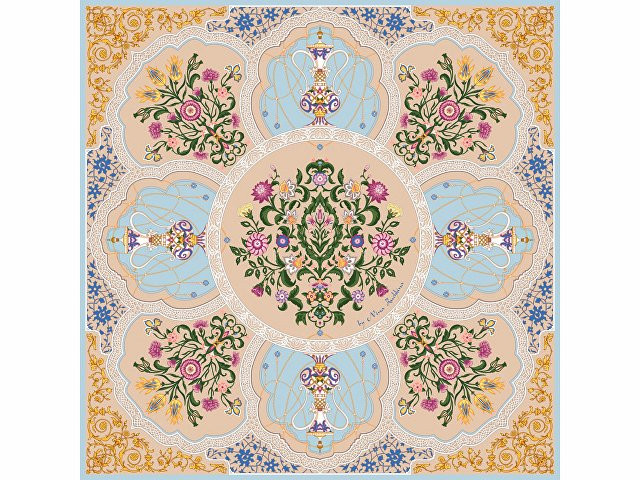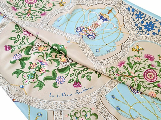 Платок “Сады Востока” от бренда “Русские в моде” by Nina Ruchkina посвящен экзотической красоте, женской привлекательности и очарованию. В центре полотна расположились цветы дивного сада, олицетворяющие собой процветание, мир и земную любовь. Рядом изображены кувшины, наполненные росой молодости и секретами вечно цветущих восточных красавиц. Принт аксессуара образуют знаменитые орнаменты востока — гирих (бесконечный “узел”) и ислими (“путь в божественный сад”). Непрерывные витиеватые линии в сочетании с узорами из гибких стеблей с зеленой листвой и пестрыми соцветиями завораживают, погружают в состояние медитации, постижения тайны мироздания через призму счастья и красоты. Облачившись в нежный шелковый платок с цветочным принтом от Нины Ручкиной, любая женщина может привнести в свой образ магию Востока, пленить и искусно укрощать мужские сердца. Дизайн: Нина Ручкина, Анна Шулик, Лола и Диана Закировы.