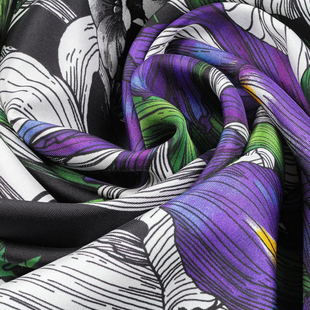Шелковый платок с цветочным принтом открывает простор для фантазии — его можно использовать как шарф, головной убор или декоративный элемент для верхней одежды и аксессуаров.