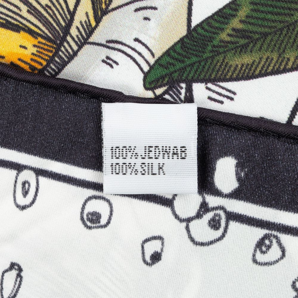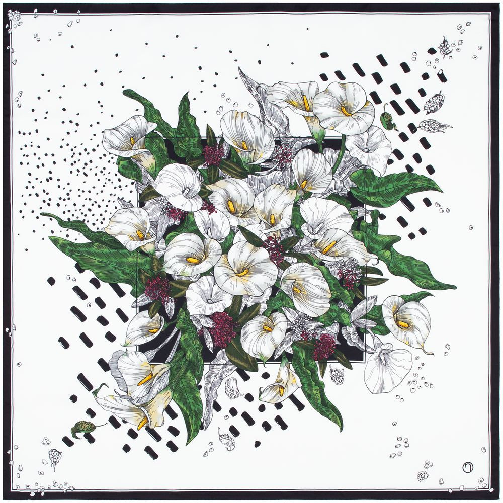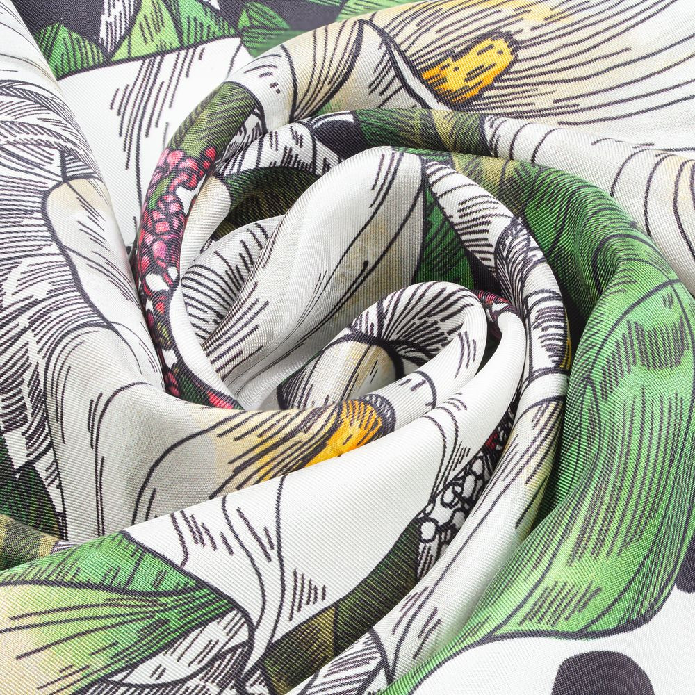 Шелковый платок с цветочным принтом открывает простор для фантазии — его можно использовать как шарф, головной убор или декоративный элемент для верхней одежды и аксессуаров.