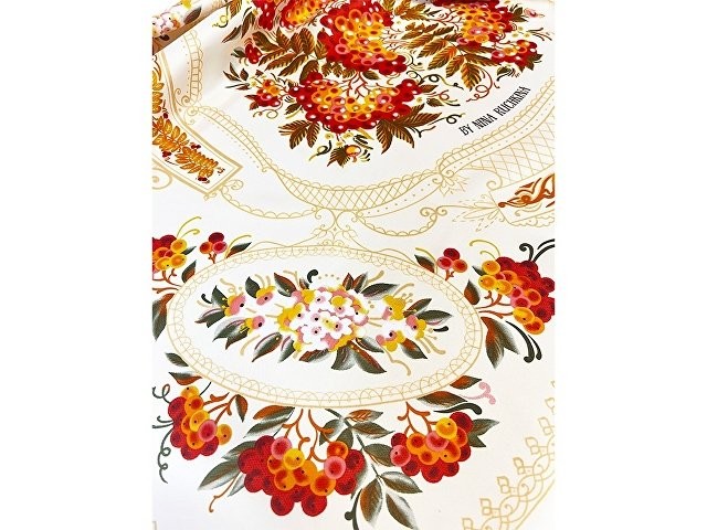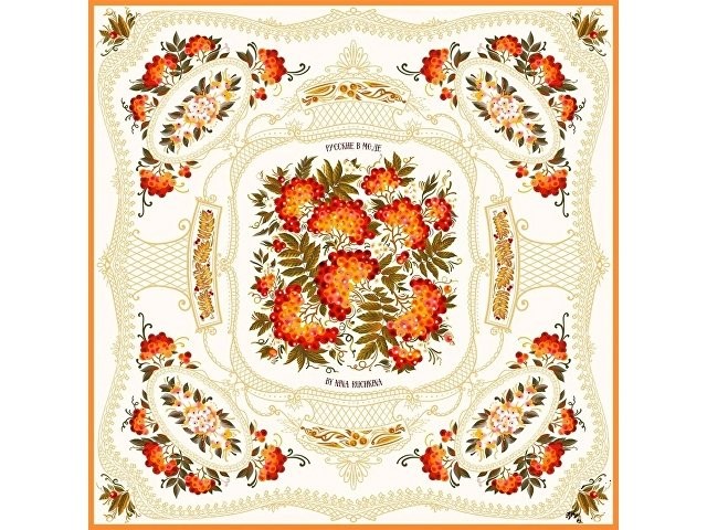 Бренд «Русские в моде» от дизайнера Нины Ручкиной с гордостью представляет дизайн платка «Тагильский поднос». «Нижний Тагил - крупнейший промышленный центр Урала, является родиной русского расписного железного подноса. Искусство уральской лаковой росписи, зародившееся в 40-е годы XVIII столетия и активно развивающееся в XXI, обогатило художественную культуру России. В нем воплотился сплав высокого профессионального мастерства, кропотливого труда художников по металлу, стремление к прекрасному и талант народных живописцев. Русская рябина - излюбленный сюжет мастеров тагильского подноса. Она абсолютно уникальна и узнаваема. Эскиз платка дополнят утонченная вязь орнаментов и ажурные решетки, присущие исключительно этому промыслу. Платок «Тагильский поднос» станет ярким акцентом в вашем гардеробе. Насыщенная терракотово-чёрная цветовая гамма плодов всегда актуальна, а нежные оттенки цветов рябины внесут настроение романтичности и легкости. Дизайнеры: Нина Ручкина и Анна Шулик
