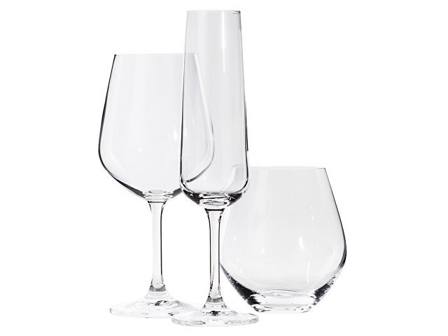 Набор бокалов состоит из 18 предметов - из шести бокалов-флютов для игристых вин, из шести бокалов для красного вина и из шести бокалов без ножки для разных видов напитков, в частности, для коктейлей. Все бокалы выполнены из бессвинцового хрусталя, экологически чистого материала, который сохраняет кристальную прозрачность, не тускнея и не мутнея. Лаконичная классическая форма бокалов, выполненных в едином стиле с учетом строгих канонов посуды для вина, которые помогают напиткам раскрыть свой вкус и аромат в полной мере, не менее хорошо подходит и для нанесения логотипа. - для игристых и тихих вин - три вида бокалов в сете - материал — бессвинцовый хрусталь, который сохраняет свою прозрачность долгие годы - идеален для нанесения логотипа — лаконичный дизайн бокалов выступит стильным фоном для брендирования