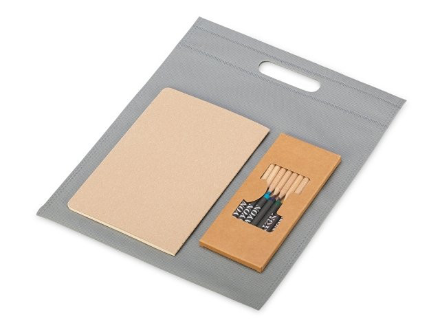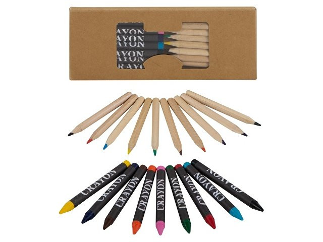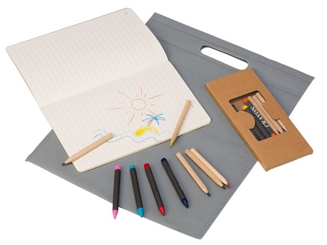 Набор из блокнота и цветных карандашей отлично подойдёт для детского промо-сувенира. Блокнот из 30 листов разлинован в линейку, блок имеет приятный бежевый цвет. Цветные карандаши и восковые мелки упакованы в индивидуальную коробочку. Шоппер из нетканого материала одновременно является упаковкой для набора, решая этот вопрос за вас. 10 цветных карандашей, 9 восковых мелков; размер блокнота А5; для брендирования подходят все товары набора; творческий мерч для детей.