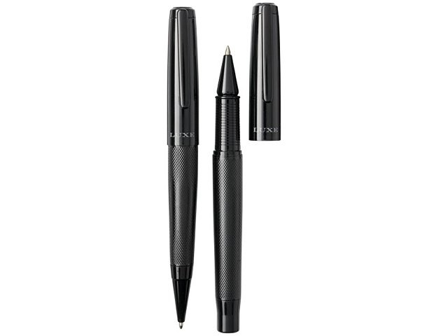 Подарочный набор из двух ручек Gloss. Подарочный набор из шариковой ручки и ручки-роллера с черним колпачком и глянцевым корпусом в подарочной коробке LUXE. Шариковая ручка: 14 см х 1,45 см, вес: 40 г, длина непрерывной линии: 800 м. Ручка-роллер: 13,8 см х 1,45 см, вес: 54 г, длина непрерывной линии: 400 м. Металл.