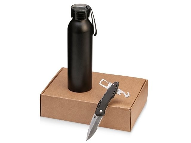 Складной нож оснащен блокиратором от случайного закрывания, что делает его безопасным в работе. В рукоять ножа также встроены отвертка, нож для ремня безопасности и серрейтор. Карабин позволяет прикрепить нож к рюкзаку или поясному ремню, чтобы обеспечить наиболее удобный и быстрый доступ к инструменту. Бутылка для воды имеет герметичную крышку и выполнена из легкого и прочного алюминия, поэтому ее удобно брать с собой. Текстурное покрытие не дает бутылке скользить в руке, а яркая крышка имеет силиконовый ремешок для подвешивания. • объем бутылки: 650 мл; • нож с карабином из антикоррозийной стали • подарочная упаковка набора входит в комплект, - вам осталось только придумать принт!