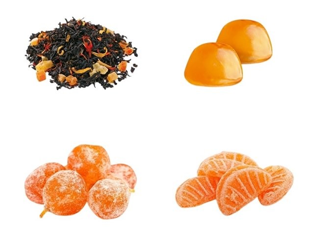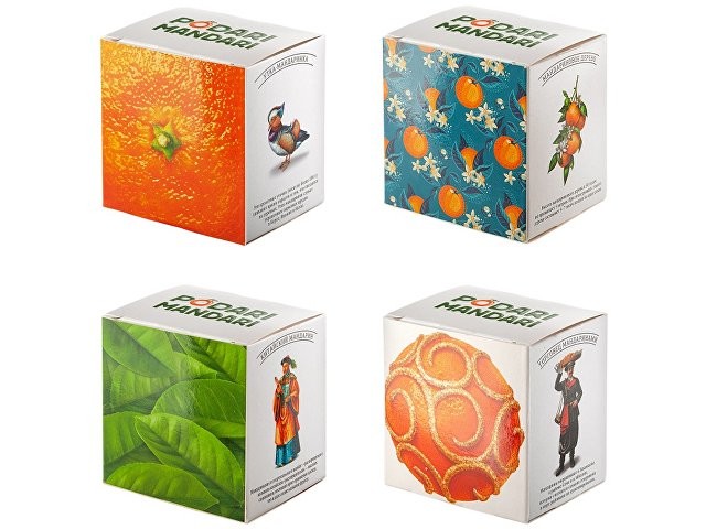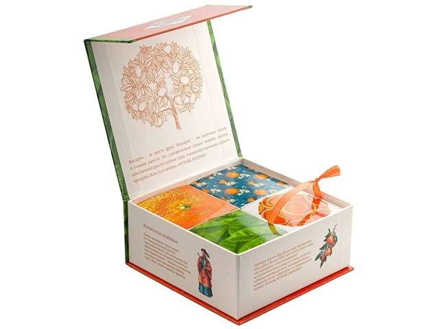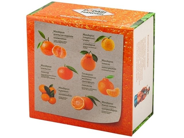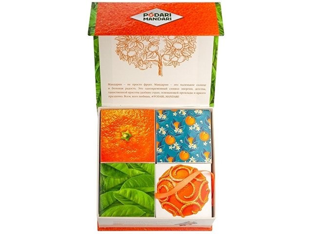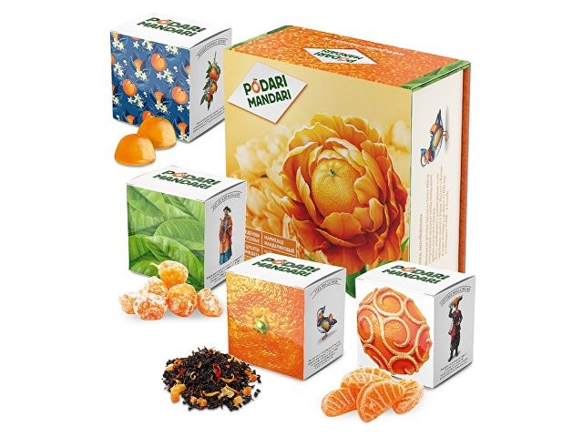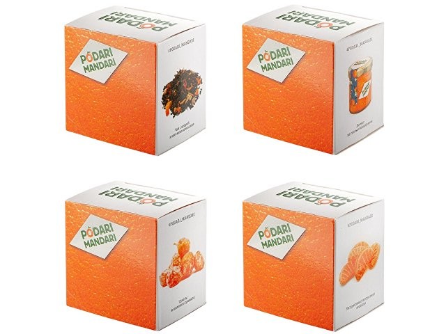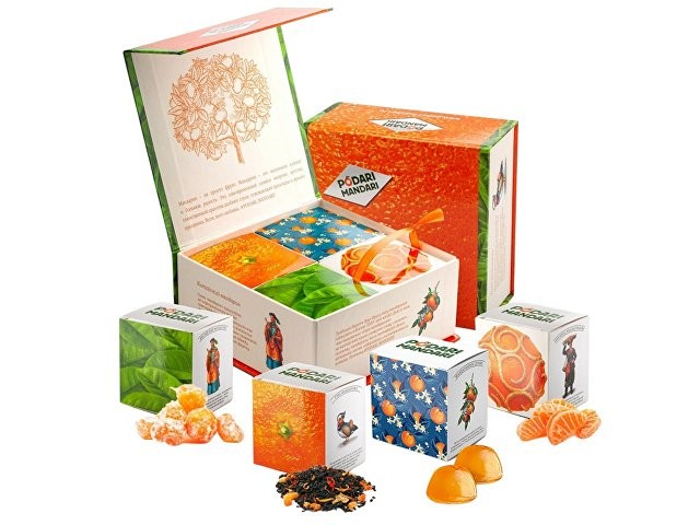Гастрономический подарочный набор ПодариМандари. Набор представляет собой метафору мандарина – одного из главных символов Нового года. Состоит из 4 продуктов: – чай с цедрой, сегментами и цветами апельсина; – мармелад из мандаринов; – цукаты из кумквата; – цитрусовые леденцы. Продукты упакованы в небольшие картонные коробочки размером 70 х 70 х 55 мм и помещены в шкатулку из переплётного картона с магнитным клапаном. Состав: Кумкват: кумкват, сахар, Е220. Мармелад: сахар, мандариновое пюре, патока, лимонная кислота, пектин. Чай: чай черный байховый, лепестки календулы, ягоды облепихи, имбирь, кусочки апельсина, шелковица. Леденцы: патока, вода, регуляторы кислотности (лимонная кислота, молочная кислота), ароматизаторы, идентичные натуральным, краситель: аннато, сахар.