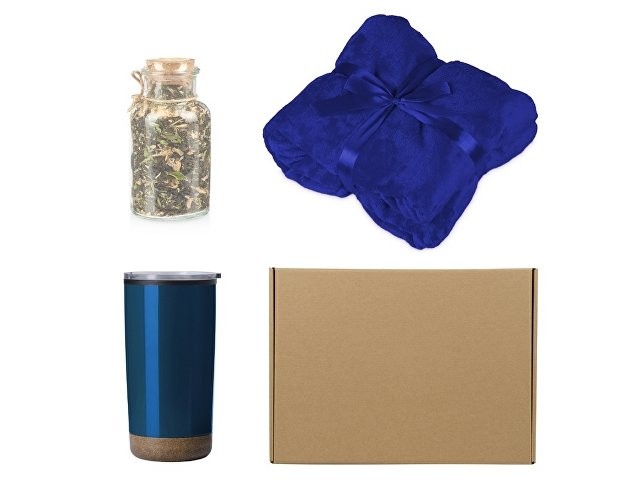 Подарочный набор с пледом, термокружкой и чаем, синий