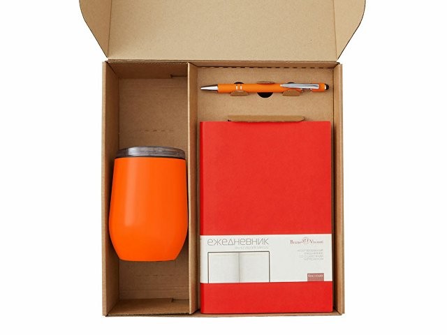 Материал: ежедневник - искусственная кожа, термокружка - нержавеющая сталь снаружи, полипропилен внутри, ручка - металл c покрытием софт-тач, ситечко - нержавеющая cталь
