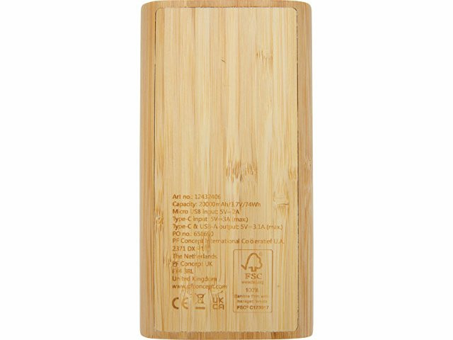 Портативное зарядное устройство емкостью 20 000 мАч из бамбука с сенсорной кнопкой включения/выключения и 4 светодиодными индикаторами для отображения оставшейся емкости батареи. Вход Micro USB 5 В/2 А, вход Type-C 5 В/3 А, выход Type-C 5 В/3.1 А макс., двойной выход USB-A 5 В/3.1 А макс., общая мощность 15.5 Вт. Поставляется с зарядным кабелем Type-C - Type-C 3 А из термополиэтилена длиной 30 см, инструкцией по эксплуатации и подарочной коробкой из крафт-бумаги. Поскольку бамбук — природный материал, цвет и размер сырья могут быть разными, что, в свою очередь, может повлиять на итоговый вид печати.