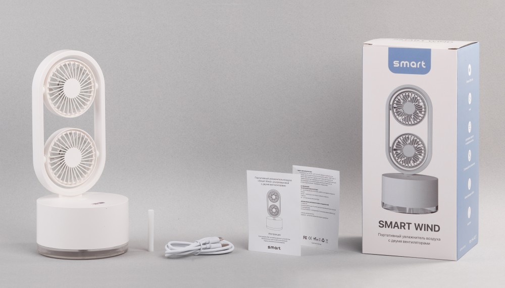 Увлажнитель Smart Wind оснащен двойным вентилятором, позволяет создавать комфортные условия там, где это необходимо, благодаря встроенному аккумулятору на 2000 mAh.
