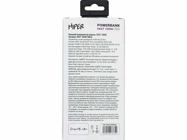 Портативный внешний аккумулятор HIPER FAST 10000 емкостью 10000 мАч (37Втч) оснащён двунаправленным портом USB-C, Micro-USB входом для зарядки, с поддержкой быстрой зарядки аккумулятора QC и PD, 2xUSB-A выходами, максимальный выходной ток 5А, максимальная мощность 22,5 Вт, поддержка быстрой зарядки стандарта QC 18 Вт, поддержка быстрой зарядки стандарта PD 18 Вт, стильный дизайн.