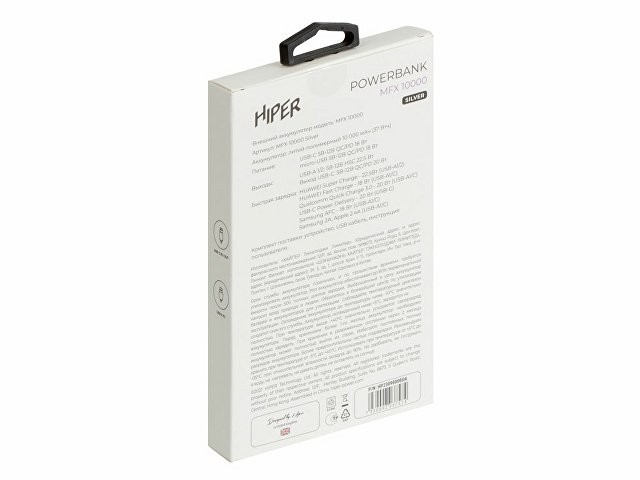 Портативный внешний аккумулятор HIPER MFX 10000 емкостью 10000 мАч (37Втч) оснащён двунаправленным портом USB-C, Micro-USB входом для зарядки, с поддержкой быстрой зарядки аккумулятора QC и PD, 2xUSB-A выходами, максимальный выходной ток 3.0А, максимальная мощность 18 Вт, поддержка быстрой зарядки стандарта QC 18 Вт, поддержка быстрой зарядки стандарта PD 18 Вт.