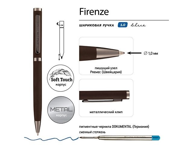 Шариковая металлическая ручка из коллекции «Firenze» от Bruno Visconti - бизнес-аксессуар, с которым вы всегда будете чувствовать себя уверенно и комфортно. Лаконичный дизайн, прочный металлический корпус, строгость формы подчеркнут статус владельца ручки. Удобство в эксплуатации и тактильно приятные ощущения подарит бархатистое покрытие Soft Touch. Ручка автоматическая, с легким поворотным механизмом подачи стержня. Надежный пишущий узел d 1,0 мм (от швейцарского производителя Premec) гарантирует высокое качество также, как и пигментные чернила Dokumental (Германия). Благодаря им писать ручкой «Firenze» одно удовольствие – она мягко скользит по поверхности бумаги, оставляя ровную, четкую линию.