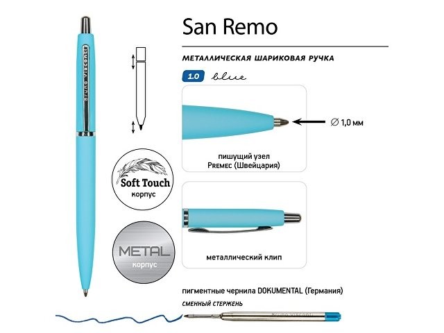 Ручка металлическая шариковая "San Remo", софт-тач, 1.0 мм, голубой
