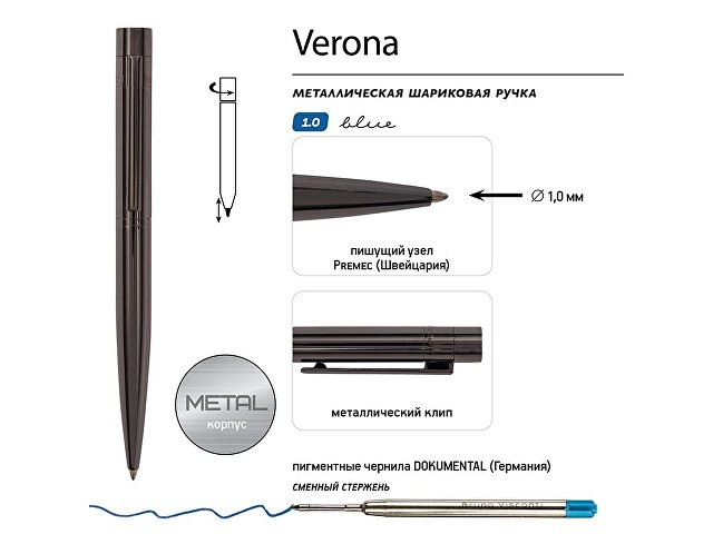 Металлическая шариковая ручка «Verona» - аксессуар, призванный стать настоящим элементом стиля, подчеркнуть индивидуальность его владельца. Как и все подарочные ручки «Bruno Visconti», «Verona» - обладательница стержня с пишущим узлом от швейцарского производителя Premec и перманентными чернилами немецкого производителя Dokumental. Поэтому можно быть абсолютно уверенным в качестве письма. Сам стержень легко и бесперебойно выдвигается за счет мягкого поворотного механизма подачи. В ручке нет ничего лишнего, но она привлекает к себе внимание. Несмотря на увеличенный диаметр корпуса - 12 мм, она изящна благодаря плавным линиям, эргономичному корпусу цвета вороненой стали.