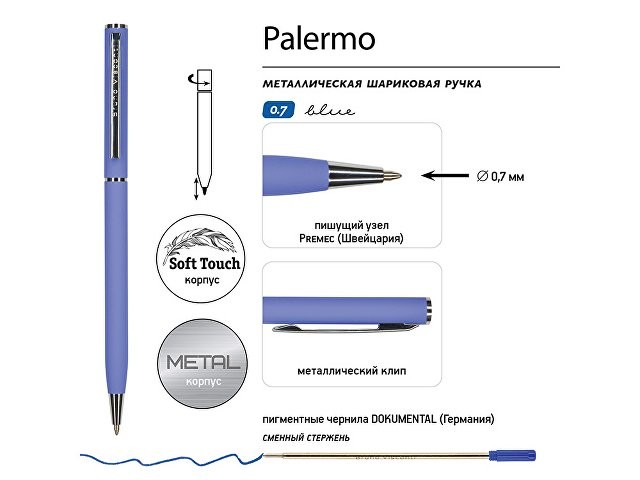 Автоматическая металлическая ручка "Bruno Visconti" серии "Palermo" однотонного цвета порадует любителей всего изящного и утонченного. Покрытие корпуса Soft Touch гарантирует дополнительный комфорт в работе с ней. Стержень легко выдвигается благодаря поворотному механизму. Синие пигментные чернила Dokumental (Германия) и пишущий узел Premec (Швейцария) обеспечивают качественное и мягкое письмо.