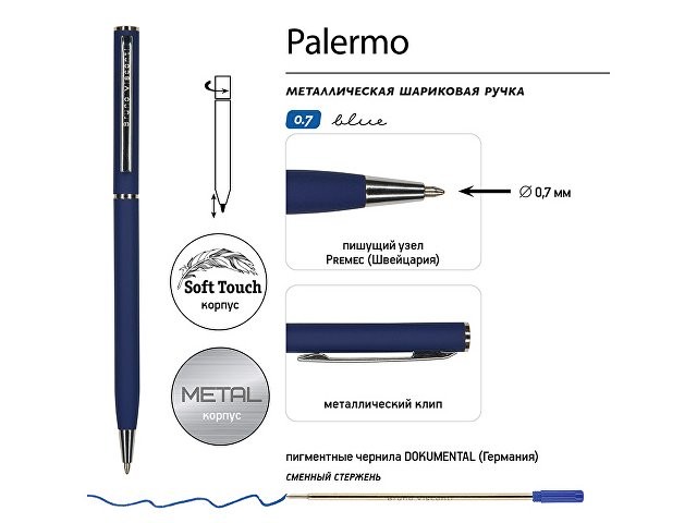 Автоматическая металлическая ручка "Bruno Visconti" серии "Palermo" однотонного цвета порадует любителей всего изящного и утонченного. Покрытие корпуса Soft Touch гарантирует дополнительный комфорт в работе с ней. Стержень легко выдвигается благодаря поворотному механизму. Синие пигментные чернила Dokumental (Германия) и пишущий узел Premec (Швейцария) обеспечивают качественное и мягкое письмо.