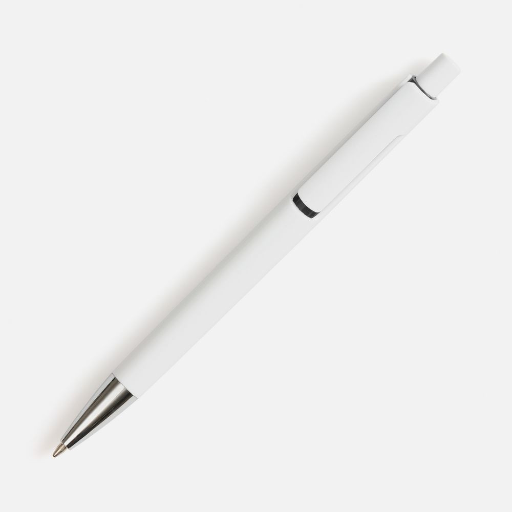 Шариковая ручка с глянцевым белым корпусом и цветовым акцентом у клипа, который дополнит логотип компании.