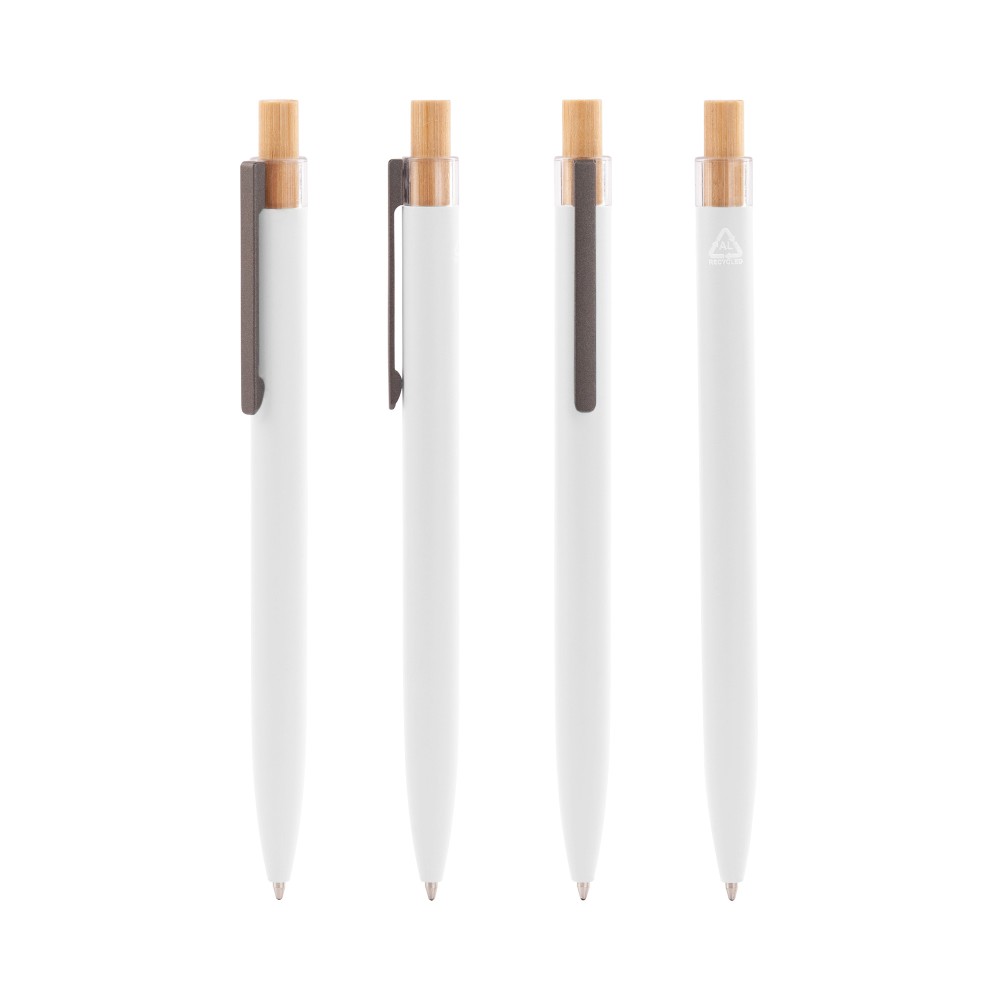 Трендовая эко-ручка, изготовленная из переработанных алюминия и пластика, с кнопкой из бамбука.