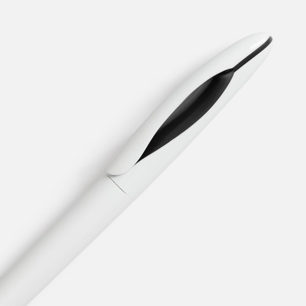 Шариковая ручка приятных округлых форм с белым глянцевым корпусом и цветовым акцентом.