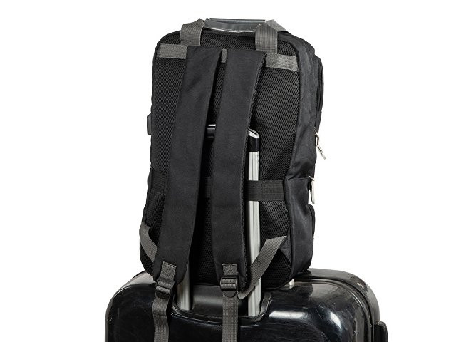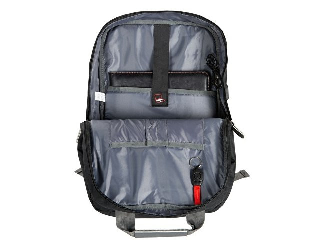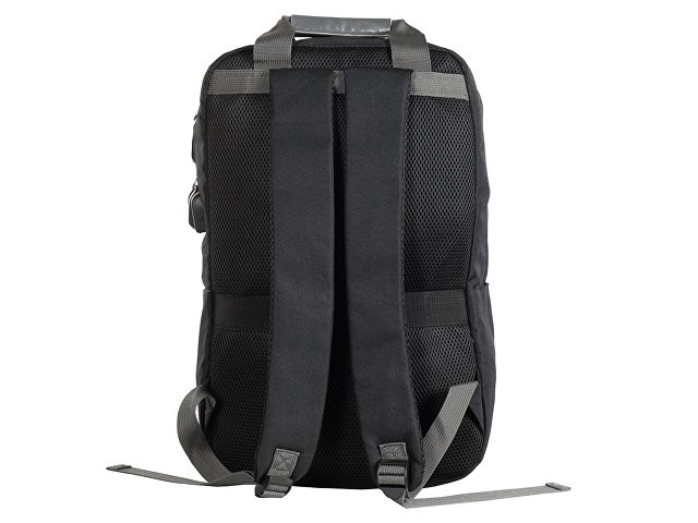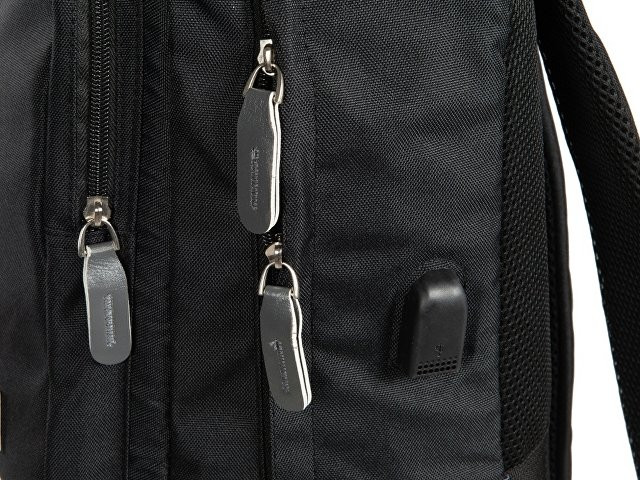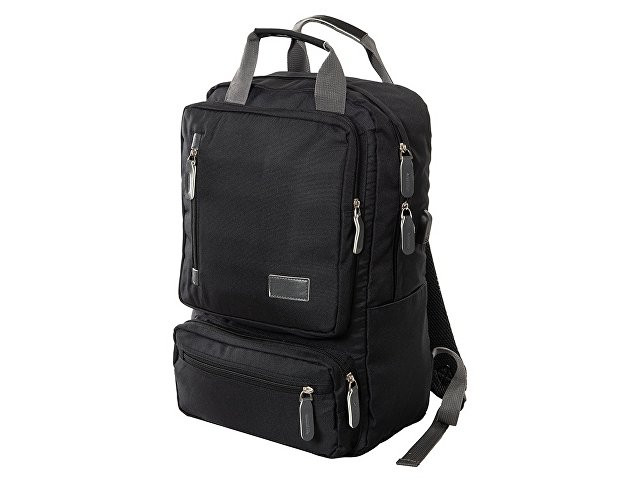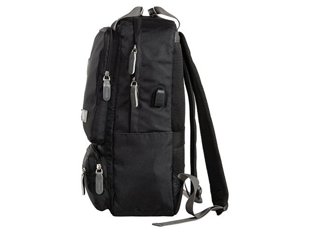 Рюкзак, в котором можно разместить все необходимое: - 2 наружных отделения на молнии, каждое из которых имеет карман на молнии, - 2 боковых кармана, - внутри органайзер, - отделение для ноутбука, - USB разъем, - сетчатая спинка, - 2 ручки вверху для большего удобства, - карабин для ключей внутри, - отделка из искусственной кожи на наружном кармане и на бегунках