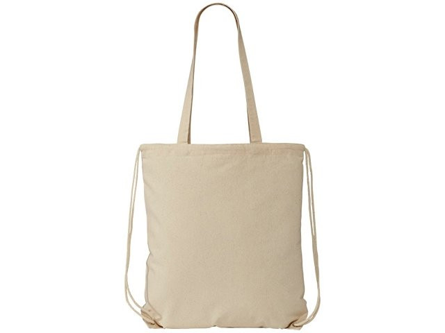 Многофункциональный хлопчатобумажный мешок с длинными ручками и затягивающим шнурком, который можно носить в качестве сумки для покупок или рюкзака. Большой основной отсек, закрывающийся затяжкой шнурка. Имеет две выпадающие ручки длиной 31 см. Вместимость: 16 л, выдерживает до 5 кг веса. Хлопок, 240 g/m2.