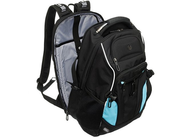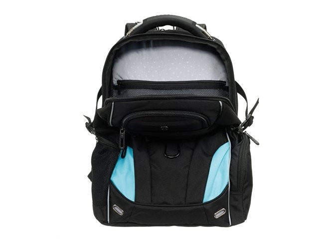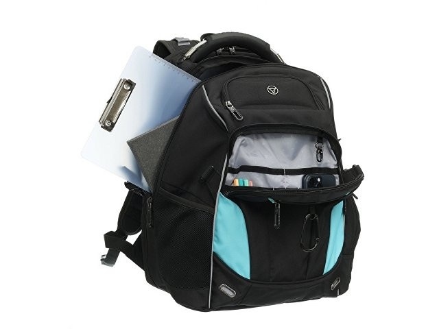 Рюкзаки TORBER серии «ПРОРЫВ» — многофункциональные, вместительные, со множеством карманов и удобной мягкой спинкой — станут незаменимыми помощниками в любом путешествии. Жизнь в городских джунглях, вылазки на природу, покорение дальних регионов и новых вершин станут комфортнее и проще, а впечатления ярче и насыщеннее. Наличие отделения для ноутбука с диагональю экрана до 15” обеспечивает безопасную и удобную переноску вашего ноутбука. Карман-органайзер предназначен для мелких предметов, также есть кольцо для ключей, кармашки для ручек, мобильного телефона и других аксессуаров. Спинка и эргономичные плечевые ремни обладают анатомической формой и системой циркуляции воздуха. Внешний карман на молнии с встроенным ударопрочным очешником надежно защитит ваши очки от повреждений. Карман для зонта или бутылок из специальной эластичной сетки подходит для ёмкостей любого размера. Объем в 34 л дает вам возможность взять с собой всё необходимое. Рюкзак выполнен в черном цвете с бирюзовыми вста