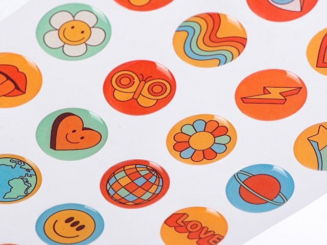 Стикеры из полимерной смолы очень яркие, чёткие и очень привлекательные. Изображение находится внутри выпуклой линзочки и выглядит объёмным. Такой эффект достигается за счёт заливки эпоксидной, или по-другому — полимерной, смолой — она наносится на изображение в жидком виде, а потом застывает, создавая объём и не давая картинке выгорать и повреждаться. Стикеры могут быть круглой, квадратной или прямоугольной формы. Для квадратных и прямоугольных стикеров немного закругляют углы, это необходимо для того, чтобы смола не вытекала при изготовлении.