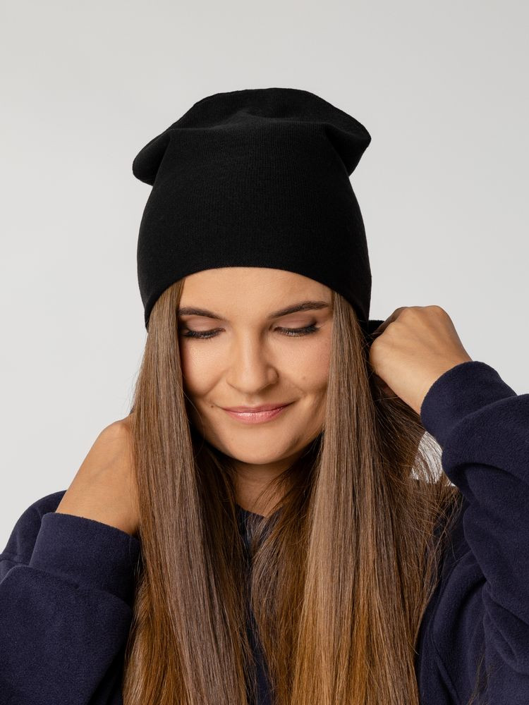 Двухслойная шапка-бини тонкой вязки, которую можно носить как с подворотом, так и без.