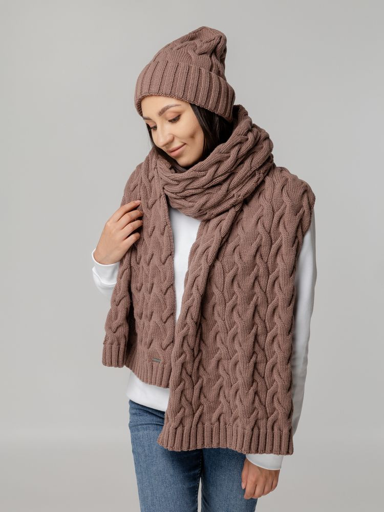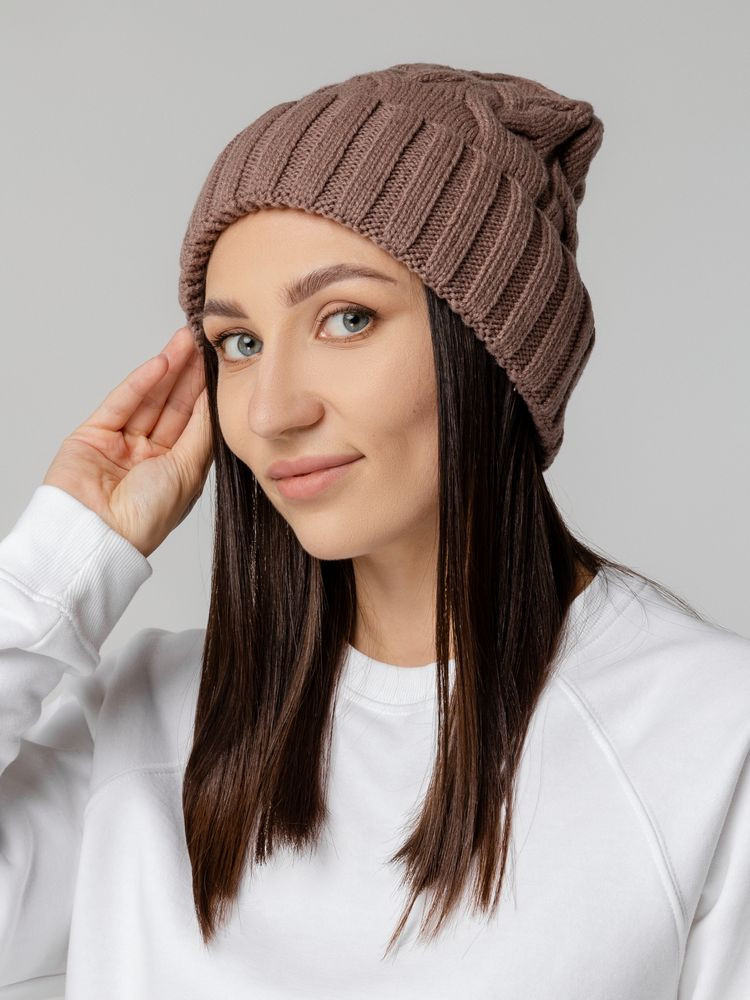 Однослойная шапка фактурной вязки с объемными косами и рельефным отворотом.