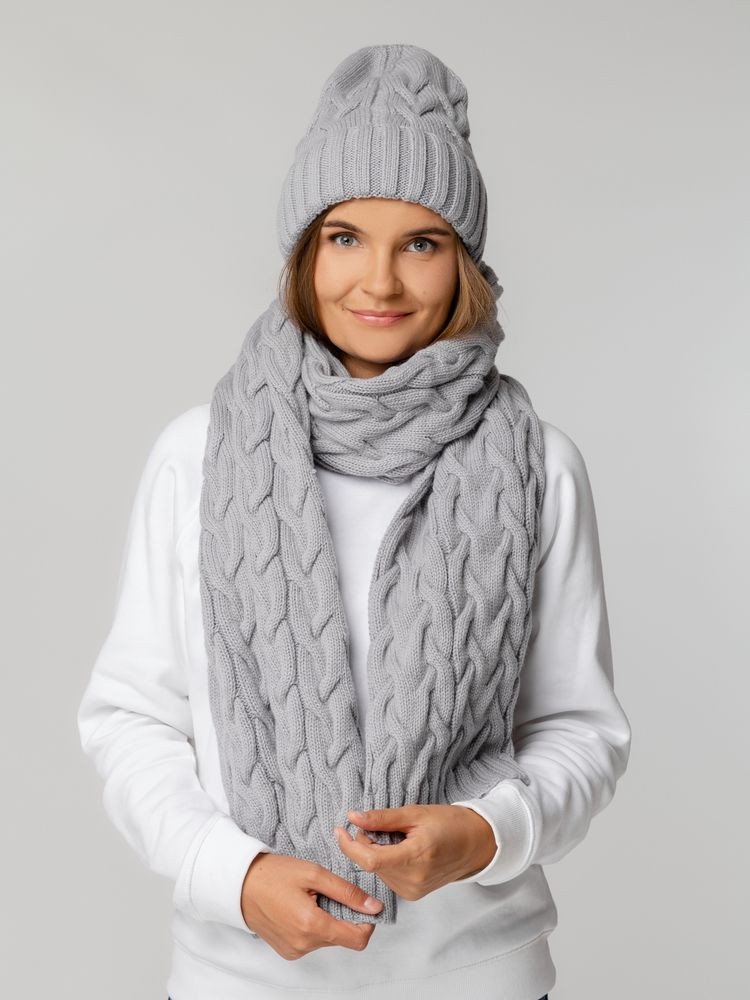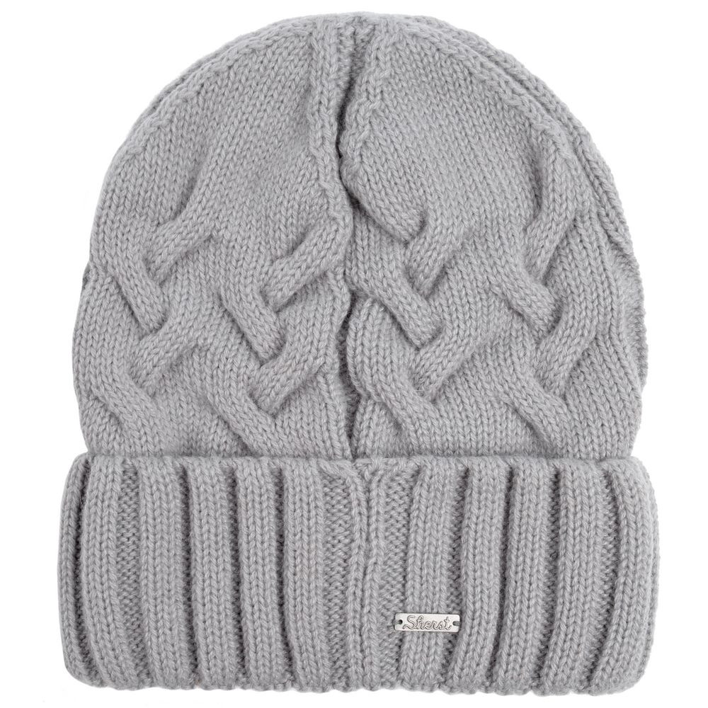 Однослойная шапка фактурной вязки с объемными косами и рельефным отворотом.