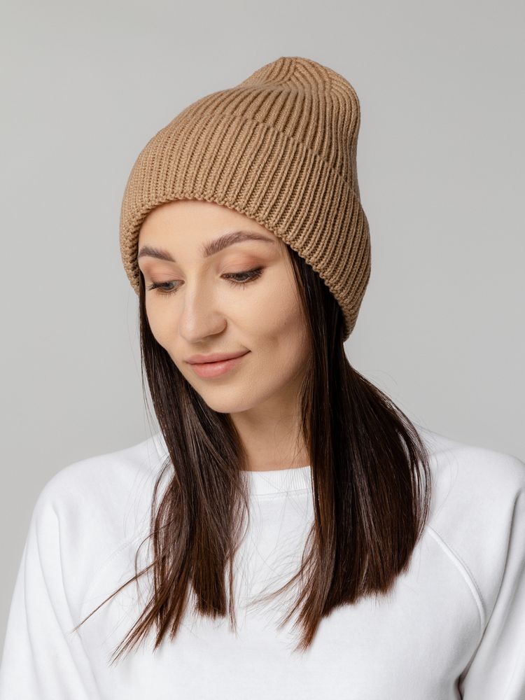 Шапка-бини из полушерстяной пряжи актуальных приглушенных оттенков. Трендовый фасон с удлиненным верхом — для расслабленного повседневного образа.
